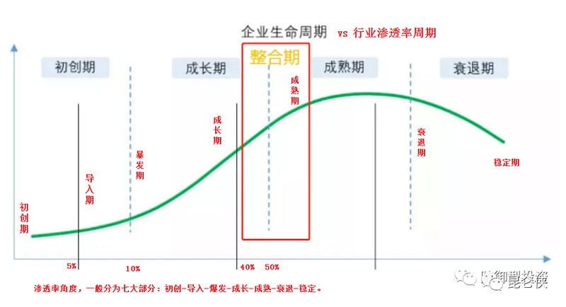当渗透率到达40%以后,则行业逐步进入成熟期,行业增速明显放慢,竞争加剧,企业估值也出现下降。
