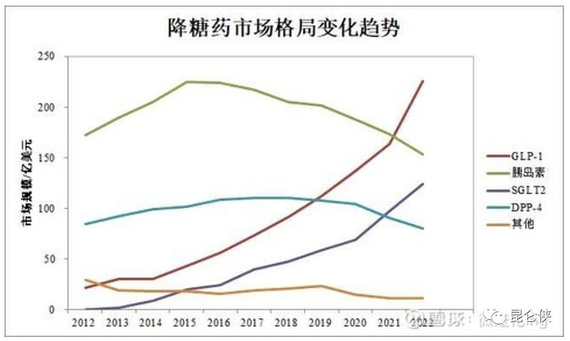 类似的已有案例是降糖药GLP-1(高血糖素样多肽-1)的上市对传统胰岛素形成降维打击,近10年来取代了大量胰岛素的市场份额。