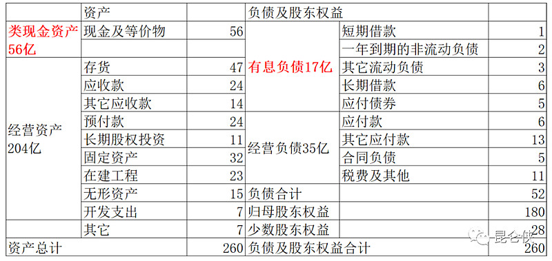 首先,看一下我制作的长春高新的简易的资产负债表,公司账上现金及等价物56亿,而有息负债17亿,现金净额39亿。