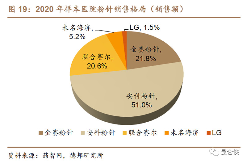 根据2020年样本医院销售数据。粉针市场安科生物销售额第一,占据约51%的市场份额,金赛药业和联合赛尔紧随其后,分别为21.8%和20.6%。