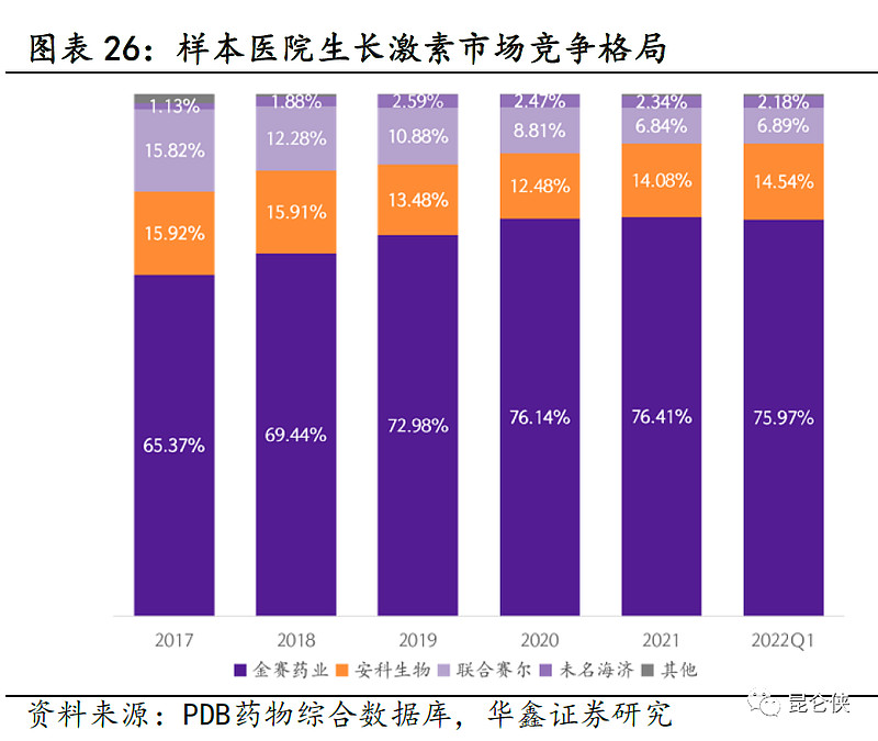 因此,多年来国内生长激素行业竞争格局相对稳定,形成了金赛药业为绝对龙头,市占率超70%,安科生物千年老二的双寡头格局,两者合计占据90%的市场份额。