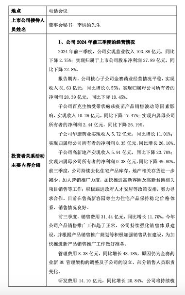 长春高新向投资者介绍了公司2024年前三季度的经营情况。2024年前三季度,公司实现营业收入103.88亿元,同比下降2.75%;实现归属于上市公司股东净利润27.89亿元,同比下降22.8%。