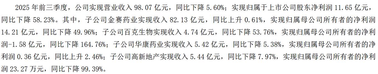 这一变化并未止步。2025年前三季度,金赛药业实现收入82.13亿元,同比微增0.61%,但归母净利润同比下降49.96%至14.21亿元。收入端的相对稳定,与利润端的大幅回落形成对比,显示盈利模式承压。