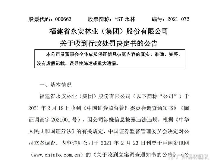 2021年8月24日,福建省永安林业(集团)股份有限公司(简称公司或永安林业)公告称,收到中国证监会的行政处罚决定书。