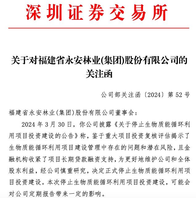 对此,深交所4月1日向永安林业下发关注函,要求永安林业详细说明公司决定停止生物质能循环利用项目投资建设的决策过程、决策依据和决策时间,公司是否及时履行了信息披露义务并向投资者充分提示风险;详细说明本次停止生物质能循环利用项目投资建设对公司定期报告带来的影响,是否会引发项目合同的相对方对公司追究违约责任,是否将导致公司2023年净利润较上年出现较大变动。