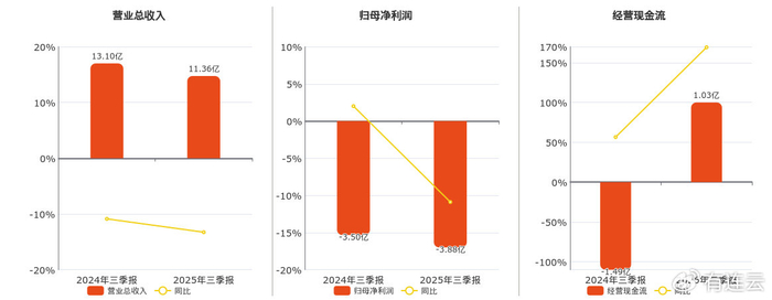 公司营业总收入为11.36亿元,较去年同报告期营业总收入减少1.74亿元,同比较去年同期下降13.27%。归母净利润为-3.88亿元,较去年同报告期归母净利润减少3807.35万元。经营活动现金净流入为1.03亿元,较去年同报告期经营活动现金净流入增加2.51亿元,实现2年连续上涨。