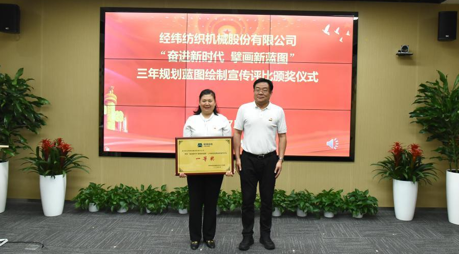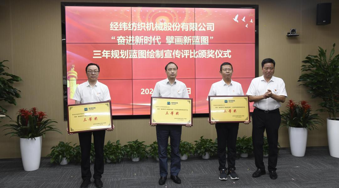 获蓝图绘制宣传评比一等奖:青岛宏大;二等奖:经纬智能、宜昌经纬;三等奖:无锡专件、常德摇架、常德纺机获奖单位党组织书记上台领奖。