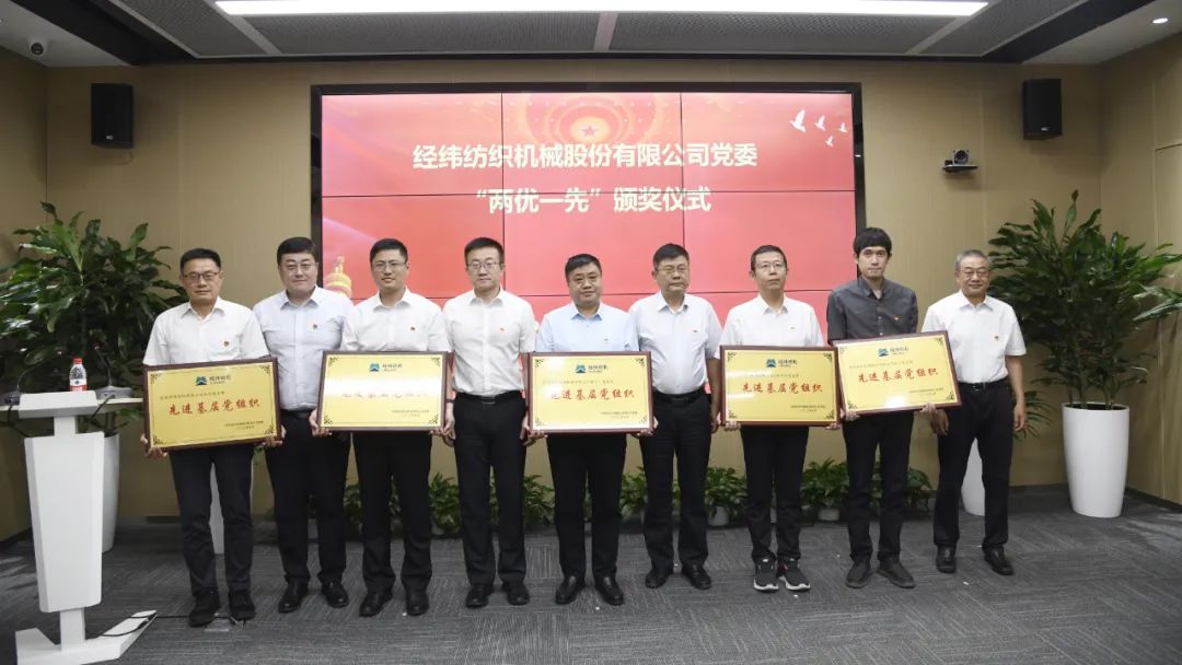 经纬智能党委、青岛宏大党委、无锡专件党委常德摇架党总支等11个先进基层党组织书记上台领奖。