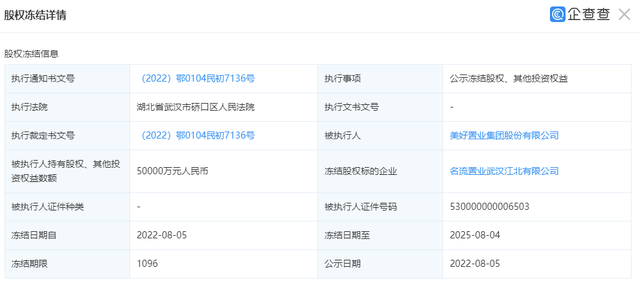 但是仅仅过了一天,美好置业集团就作为被执行人,旗下的名流置业武汉江北有限公司新增被冻结5亿元,冻结日期达3年。
