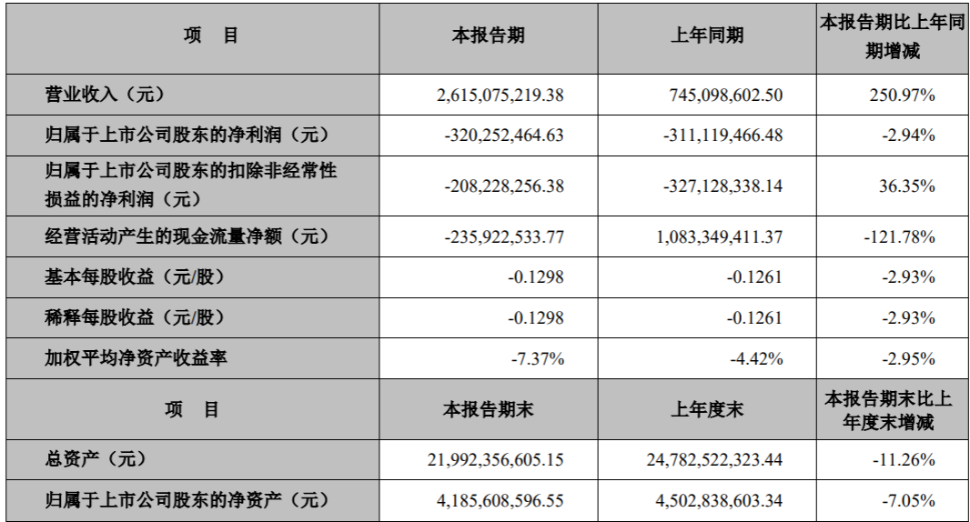 报告期内,公司实现营业收入26.15亿元,同比增长250.97%;实现归属于公司股东的净利润-3.2亿元,同比下降2.94%。