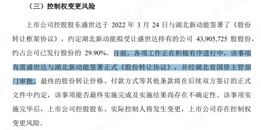 2022年3月,盛世达与湖北省新动能基金管理有限公司(以下简称湖北新动能)签署协议,向湖北新动能转让上市公司29.9%股权。湖北新动能背后实控人为湖北省国资委。