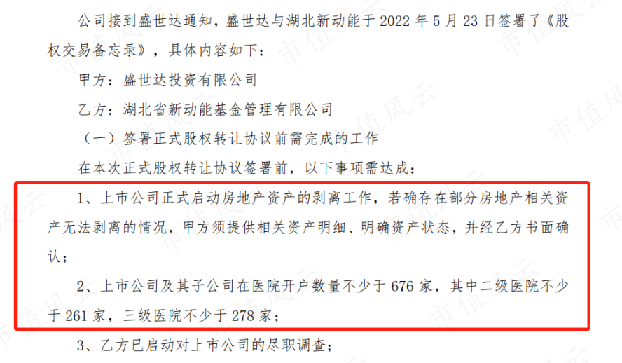备忘录中明确表示,签署正式转让协议前,公司需要正式启动剥离房地产工作、上市公司及其子公司在医院开户数量不少于676家……