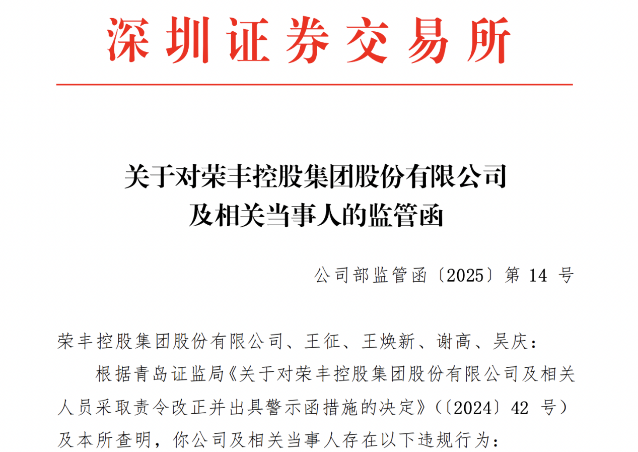 根据青岛证监局《关于对荣丰控股集团股份有限公司及相关人员采取责令改正并出具警示函措施的决定》(〔2024〕42号)及深交所查明,荣丰控股及相关当事人存在以下违规行为: