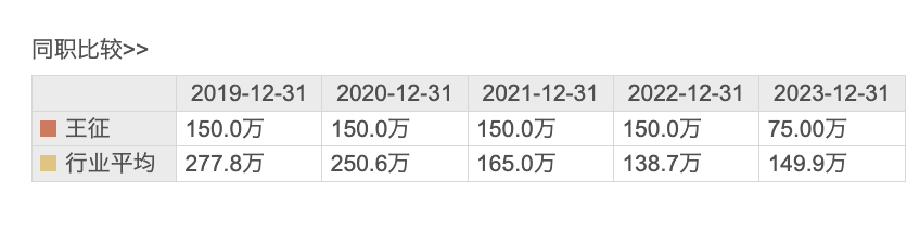 东方财富数据显示,2019年至2022年,王征薪酬均为150万元。到了2023年,其薪酬下降50%至75万元。