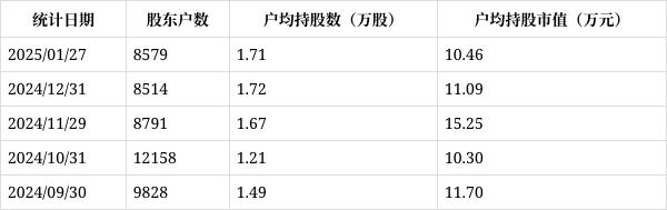 从2月27日公开信息显示,荣丰控股截至2025年1月27日公司股东户数为8579户,较上期(2024年12月31日)增加65户,增幅为0.76%,变化不大。
