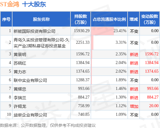 根据ST金鸿2023年一季报公布的十大股东详情如下: