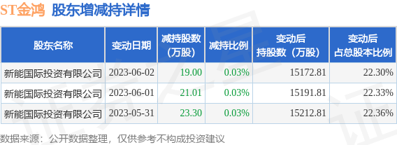 6月5日ST金鸿发布公告《ST金鸿:关于公司控股股东被动减持数量过半的公告》,其股东新能国际投资有限公司于2023年5月31日至2023年6月2日间合计减持63.31万股,占公司目前总股本的0.093%,变动期间该股股价上涨0.0%,截止6月2日收盘报1.72元。