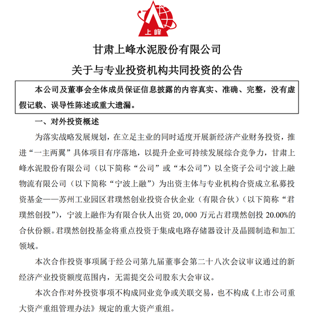集微网消息,7月26日晚间,上峰水泥发布关于与专业投资机构共同投资的公告,称上峰水泥以全资子公司宁波上融物流有限公司(以下简称“宁波上融”)为出资主体与专业机构合资成立私募投资基金——苏州工业园区君璞然创业投资合伙企业(有限合伙)(以下简称“君璞然创投”),宁波上融作为有限合伙人出资 20,000 万元占君璞然创投 20.00%的合伙份额。君璞然创投基金将重点投资于集成电路存储器设计及晶圆制造和加工领域。