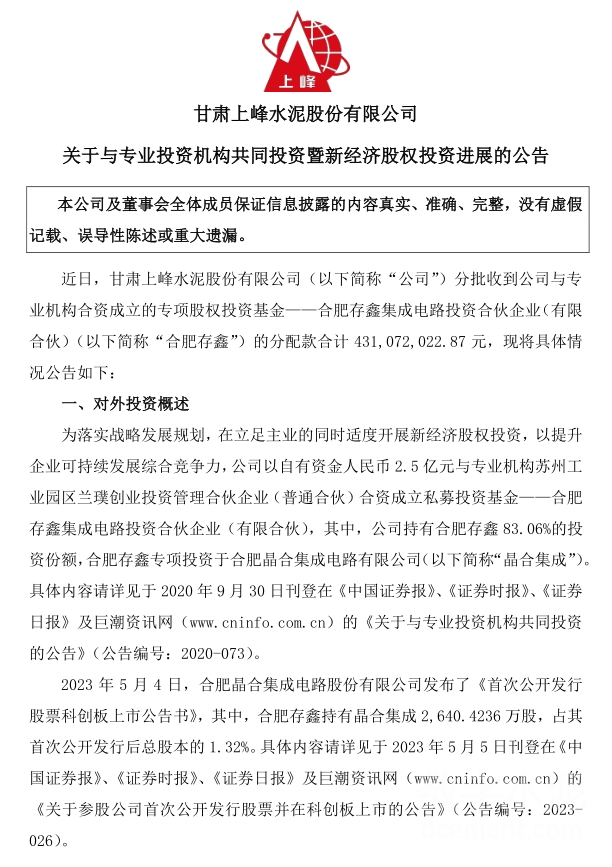 2月11日,上峰水泥发布《关于与专业投资机构共同投资暨新经济股权投资进展的公告》称,近日分批收到公司与专业机构合资成立的专项股权投资基金合肥存鑫集成电路投资合伙企业(有限合伙)的分配款合计4.31亿元。