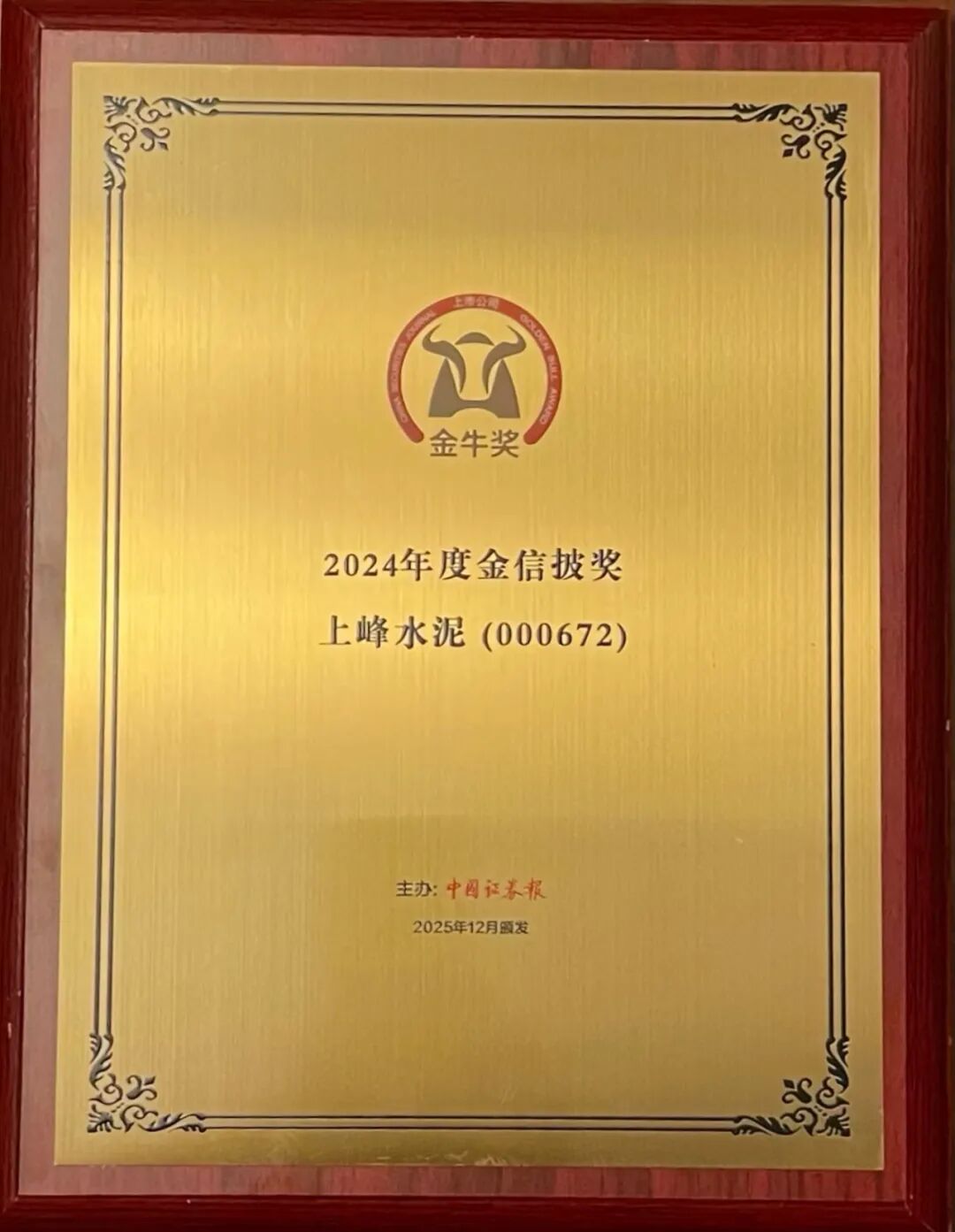 12月6日,在中国证券报、中证网主办的上市公司金牛奖颁奖典礼上, 上峰水泥 荣获本届金牛奖核心奖项“金信披奖”;12月7日,公司董事会秘书在2025年度上证上市公司高质量发展大会暨上证金质量奖评选中荣膺“卓越董秘奖”;近期公司董事会秘书还获得了新财富杂志评选的年度“最佳董秘”奖。系列奖项荣誉也体现了各专业机构、媒体、资本市场各方面对 上峰水泥 在规范治理、信息披露、投资者关系管理等各项工作的积极评价与高度认可。