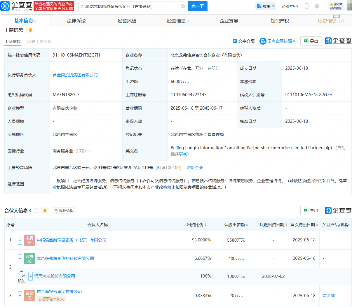 近日,北京龙弗信息咨询合伙企业(有限合伙)成立,出资额6000万元,经营范围包含:社会经济咨询服务;信息技术咨询服务;咨询策划服务;企业管理咨询等。股权穿透显示,该合伙企业由中腾信金融信息服务(北京)有限公司、恒天海龙(000677)旗下北京多弗海龙飞控科技有限公司等共同出资。