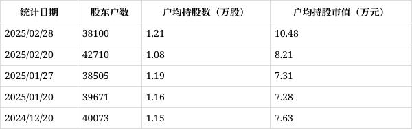 从3月10日公开信息显示,襄阳轴承截至2025年2月28日公司股东户数为3.81万户,较上期(2025年2月20日)减少4610户,降幅为10.79%,持股趋于集中。