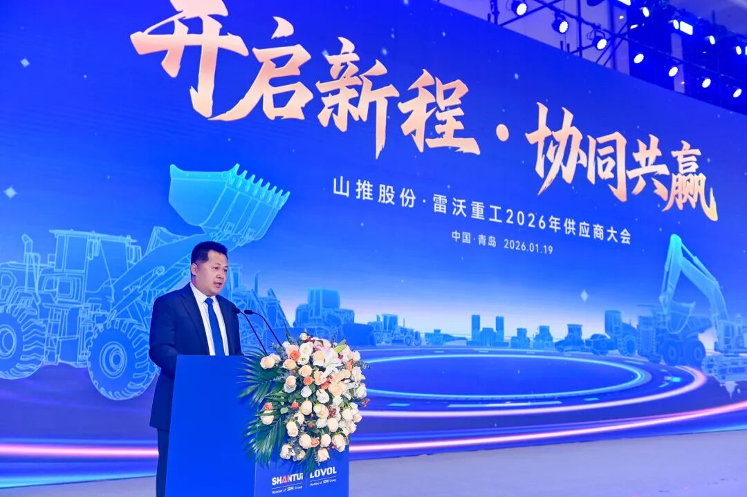 1月19日,以“开启新程协同共赢”为主题的山东重工山推股份?雷沃重工2026年供应商大会在青岛举行。山东重工集团集采总监曲正堂出席并致辞。山推股份党委书记、董事长李士振,党委副书记、总经理张民出席会议。