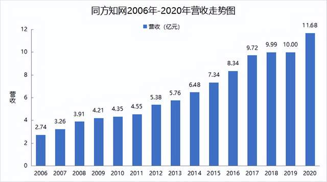同方股份2008年上市,第一份财报数据显示,同方知网2006年营收2.74亿元,当年毛利率48.5%。此后14年间,同方知网的营收规模翻了三倍,到2020年达到11.68亿元。