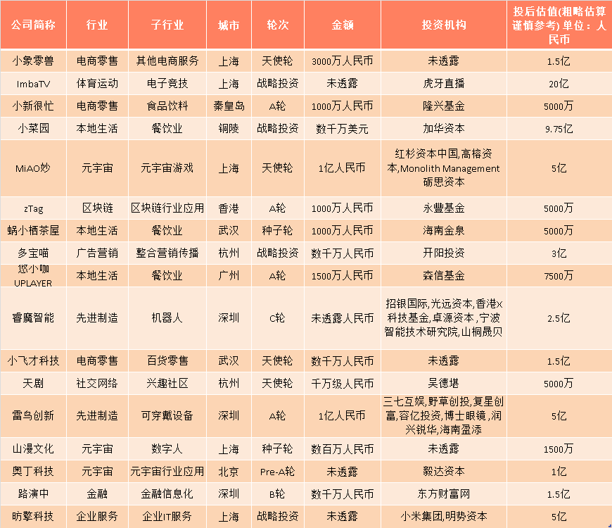 就行业分布来看,总体较为分散,其中电商零售、本地生活和元宇宙均有3起,先进制造2起,其余分布于体育运动、区块链、广告营销、社交网络、金融和企业服务领域。