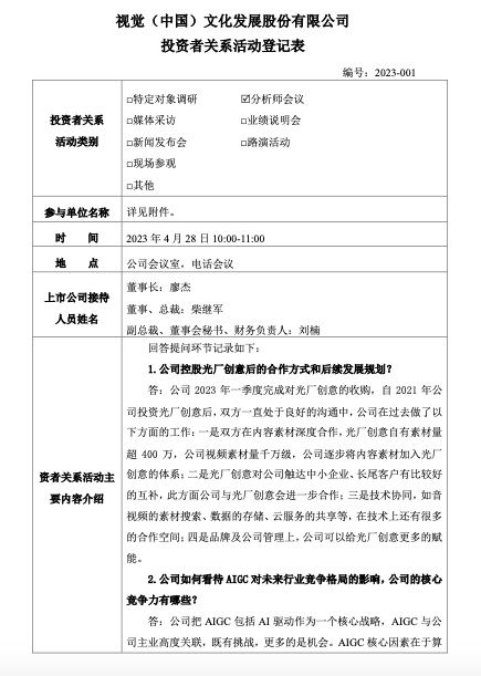 视觉(中国)文化发展股份有限公司(以下简称“视觉中国”或“公司”)5月4日发布公告称,公司于近日与多家机构投资者进行了分析师会议。在会议中,视觉中国透露,公司把AIGC包括AI驱动作为一个核心战略,AIGC与公司主业高度关联,既有挑战,更多的是机会。公司将提供的AI搜索+AI生成双服务体系,在没有AIGC之前是做不到的。