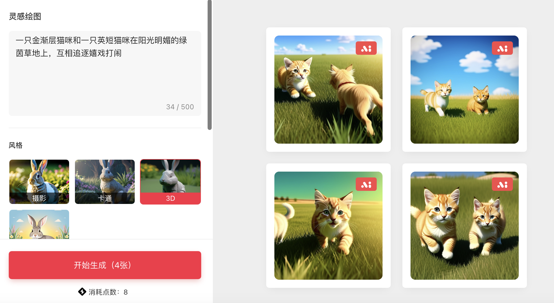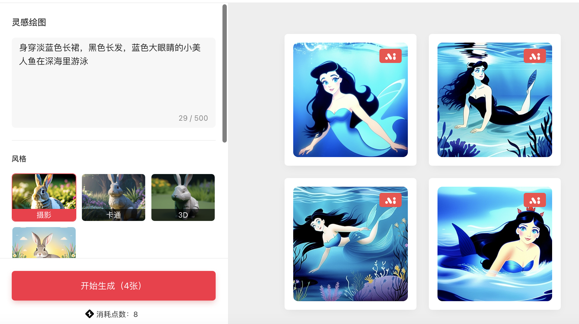记者在官网注意到,本次上线的AI灵感绘图功能,根据文字,可以生成摄影、卡通、3D、插画四种不同风格的图片素材;内测账号有一定的点数限额,每生成一次图片(共4张图)将消耗8个点数。