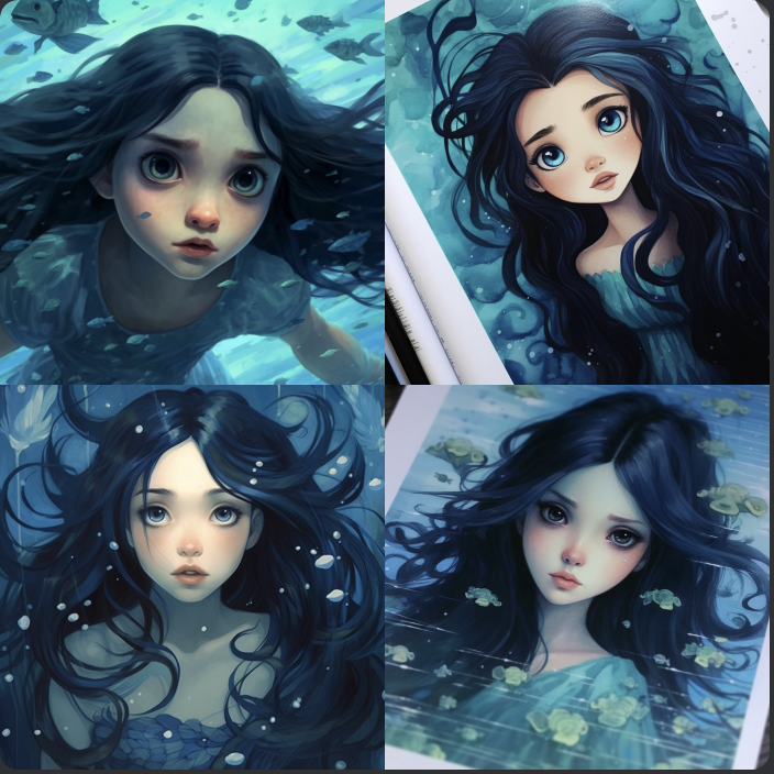 我们首先输入了一个绘画需求,“帮我画一幅,身穿淡蓝色长裙,黑色长发,蓝色大眼睛的小美人鱼在深海里游泳的画”。