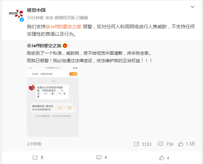 视觉中国微博回应摄影师遭人身威胁:我们支持@Jeff的星空之旅报警,反对任何人利用网络进行人身威胁,不支持任何非理性的言语以及行为。