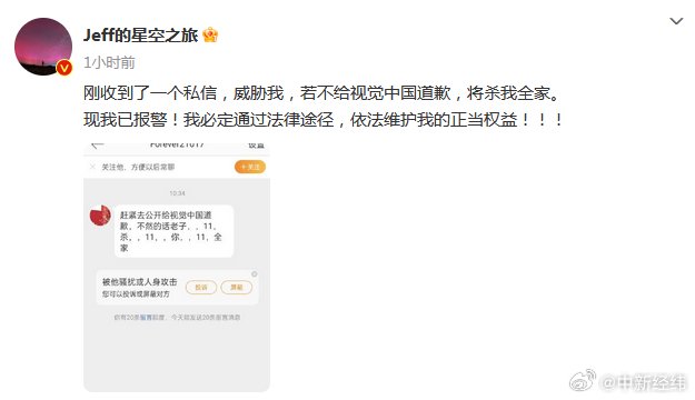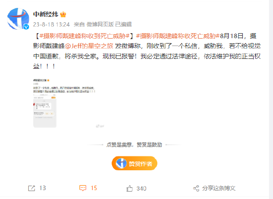 【#摄影师戴建峰称收到死亡威胁#】#摄影师戴建峰称收死亡威胁#8月18日,摄影师戴建峰@Jeff的星空之旅发微博称,刚收到了一个私信,威胁我,若不给视觉中国道歉,将杀我全家。现我已报警!我必定通过法律途径,依法维护我的正当权益!!!
