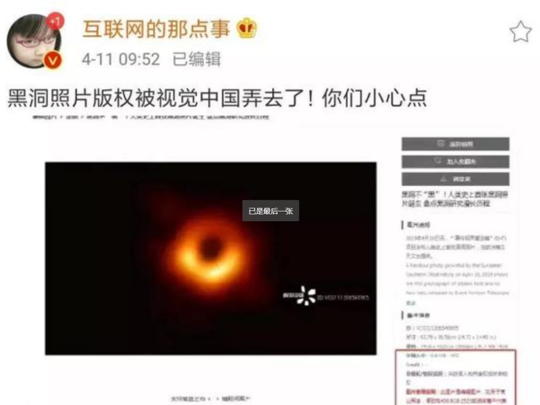 当时因为视觉中国把这张黑洞图片放到自己图库里,并明码标价收费的事,就吵过一次。