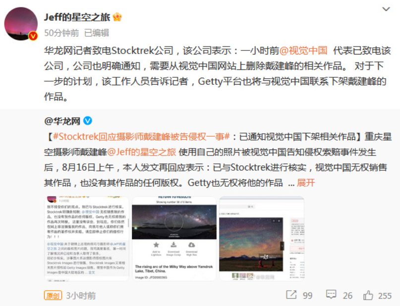 目前事情的最新进展,是华龙网记者从 Stocktrek 那里了解到,Getty 将联系视觉中国,“计划”下架相关图片。