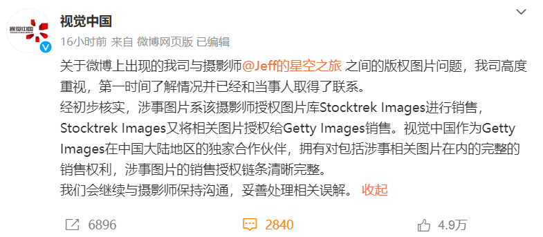 并宣称,视觉中国拥有对涉事图片的“完整销售权”。