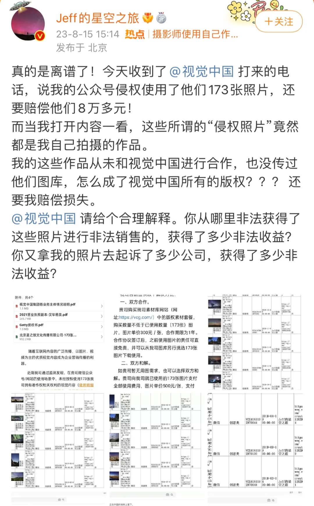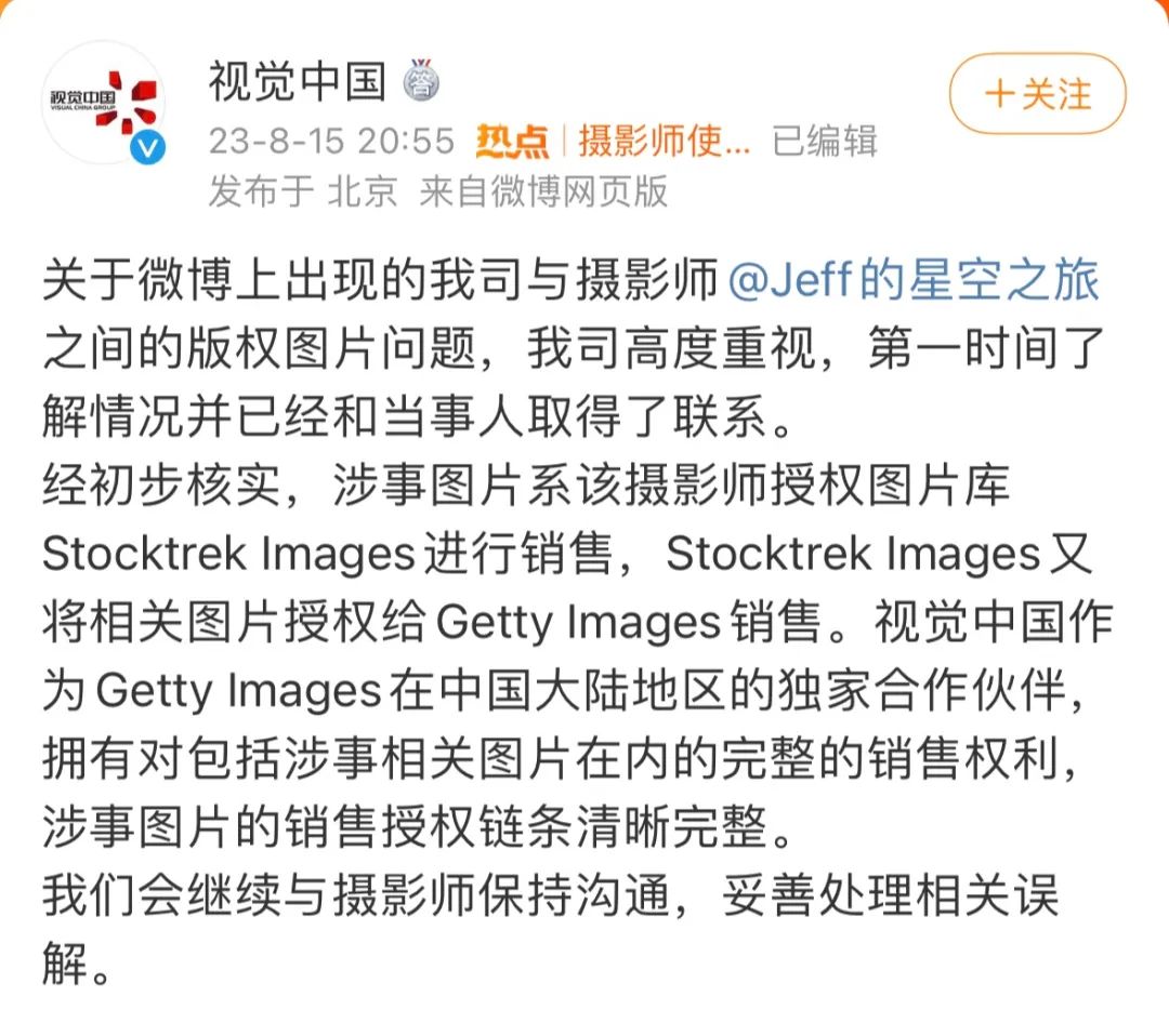 近日,科学科普博主星空摄影师戴建峰发微博称,自己拍的照片被视觉中国告侵权,对方要求自己赔偿8万多元。对此,视觉中国称,其拥有对涉事相关图片的销售权利。随后,视觉中国创始人柴继军回应“系误会,已与摄影师取得联系”。不过,戴建峰并不认可并表示,视觉中国无权销售他的作品,不存在所谓“误解”。双方的争论随即引发热议。