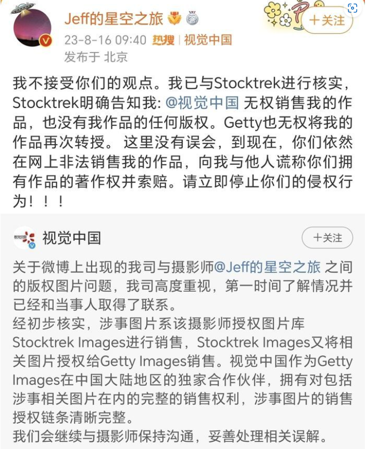 据媒体报道,Stocktrek公司工作人员表示,Stocktrek公司未直接与视觉中国合作,但与Getty公司有合作关系,而Getty公司和视觉中国有合作,视觉中国的照片是从Getty公司来的,“我也联系了Getty,告诉他们,Jeff的作品不能在视觉中国发行。”