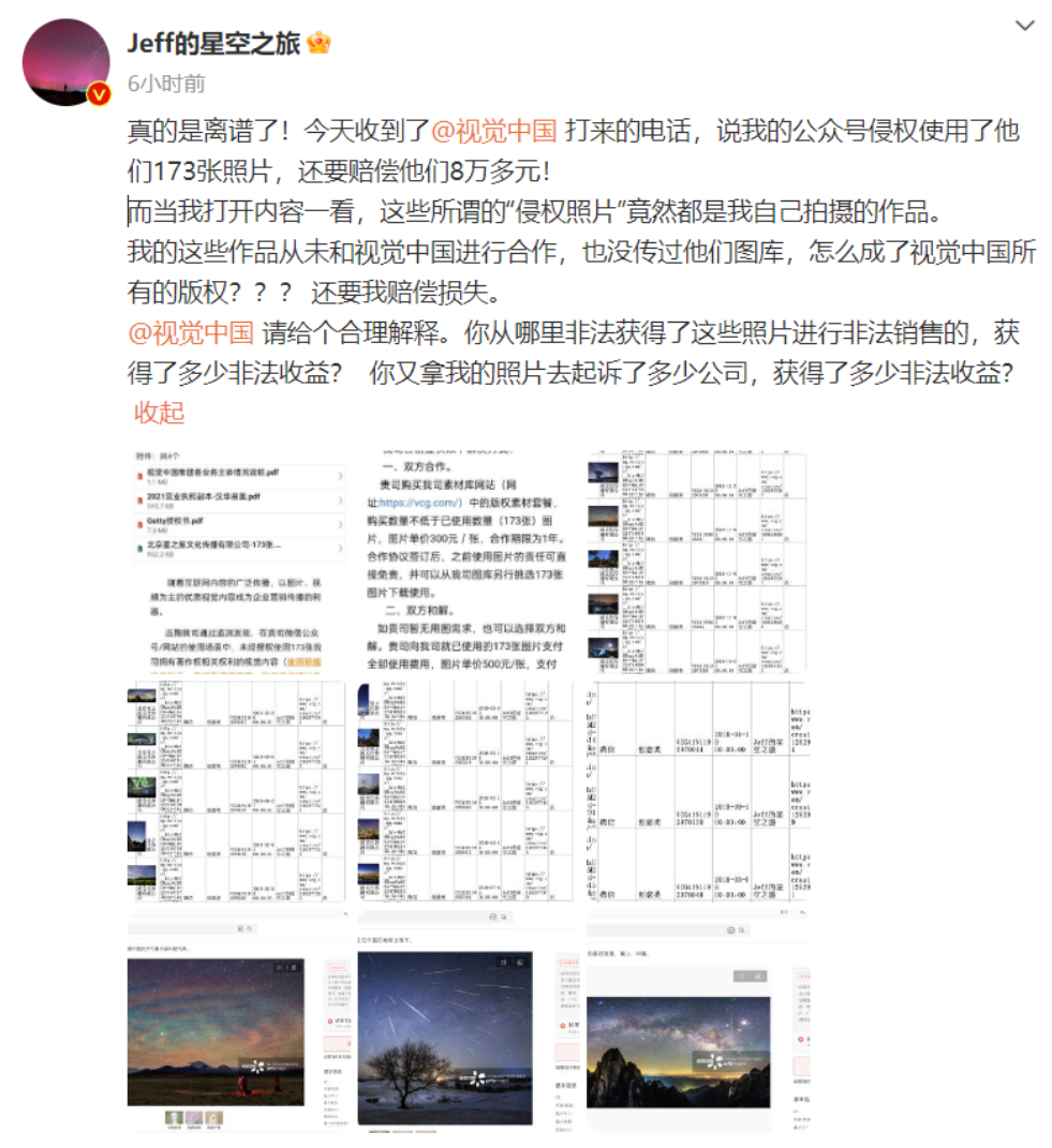 8月15日,摄影博主戴建峰在其微博@Jeff的星空之旅发帖称,当日他收到了视觉中国打来的电话,说他的公众号侵权使用了视觉中国的173张照片,要赔偿8万多元。