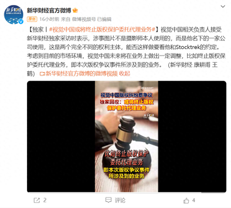 报道还称,考虑到目前的市场环境,视觉中国未来将在业务上做出一定调整,比如终止版权保护委托代理业务,即本次版权争议事件所涉及到的业务。