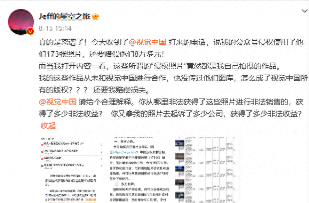 8 月 15 日 15:44,中国探险协会会员、首批签约摄影师戴建峰(微博名:Jeff 的星空之旅)发文讲述自己遭遇视觉中国“离谱”索赔: