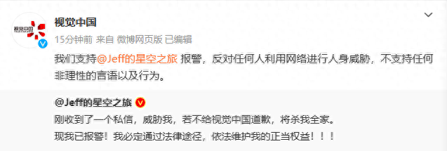 “刚收到了一个私信,威胁我,若不给视觉中国道歉,将杀我全家。现我已报警!我必定通过法律途径,依法维护我的正当权益!!!”