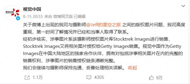 8 月 15 日 20:55,在舆论发酵、遭到集体声讨后,视觉中国在官方微博上发出一份声明: