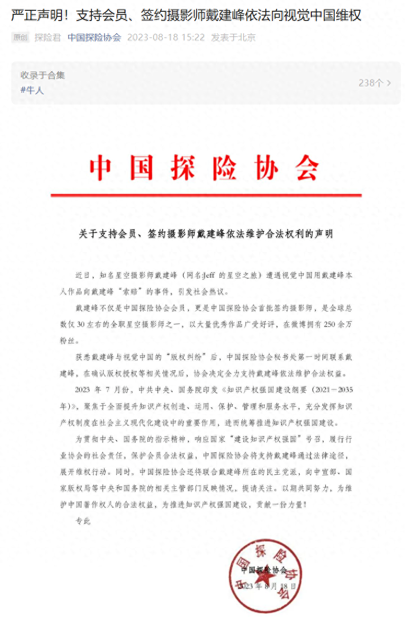 8 月 18 日 15:22,中国探险协会官方公众号发布声明称:支持会员、签约摄影师戴建峰依法向视觉中国维权。同时,中国探险协会还将联合戴建峰所在的民主党派,向中宣部、国家版权局等中央和国务院的相关主管部门反映情况,提请关注。