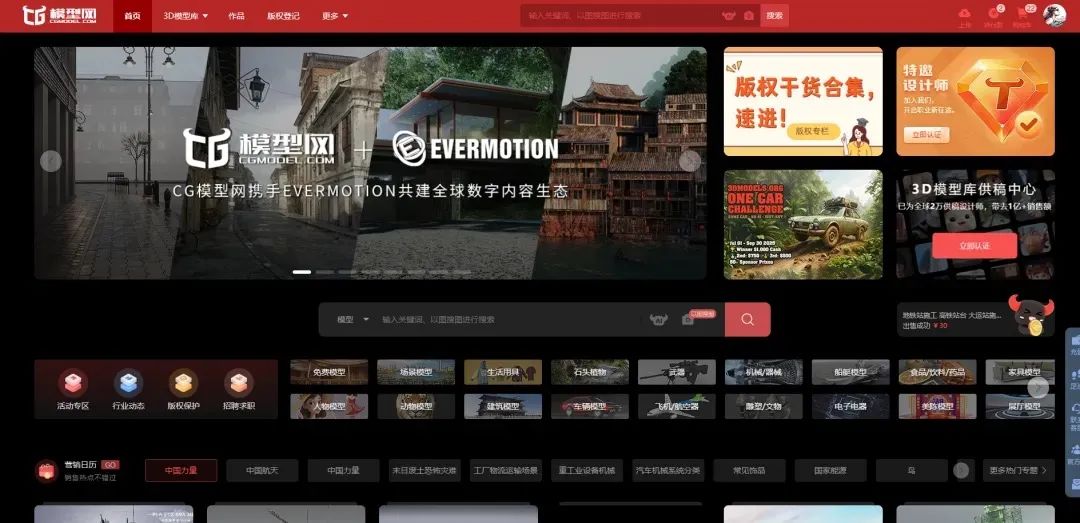 CG模型网作为国内领先的3D数字资产交易平台,拥有超300万件3D数字资产,为创作者提供3D素材交易、社区交流、赛事活动、教育培训以及IP衍生品开发等服务,为百度、华为、腾讯、阿里等超过5000家传媒、科研教育等领域企业与机构提供专业的3D素材、数字资产管理、创意众包以及培训解决方案,对接国际资源,赋能中国创作;并通过海量中国原创内容触达十万余海外用户,传播东方创意,连接全球3D创意生态。