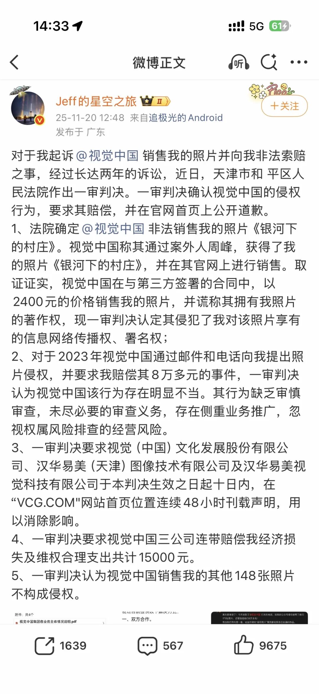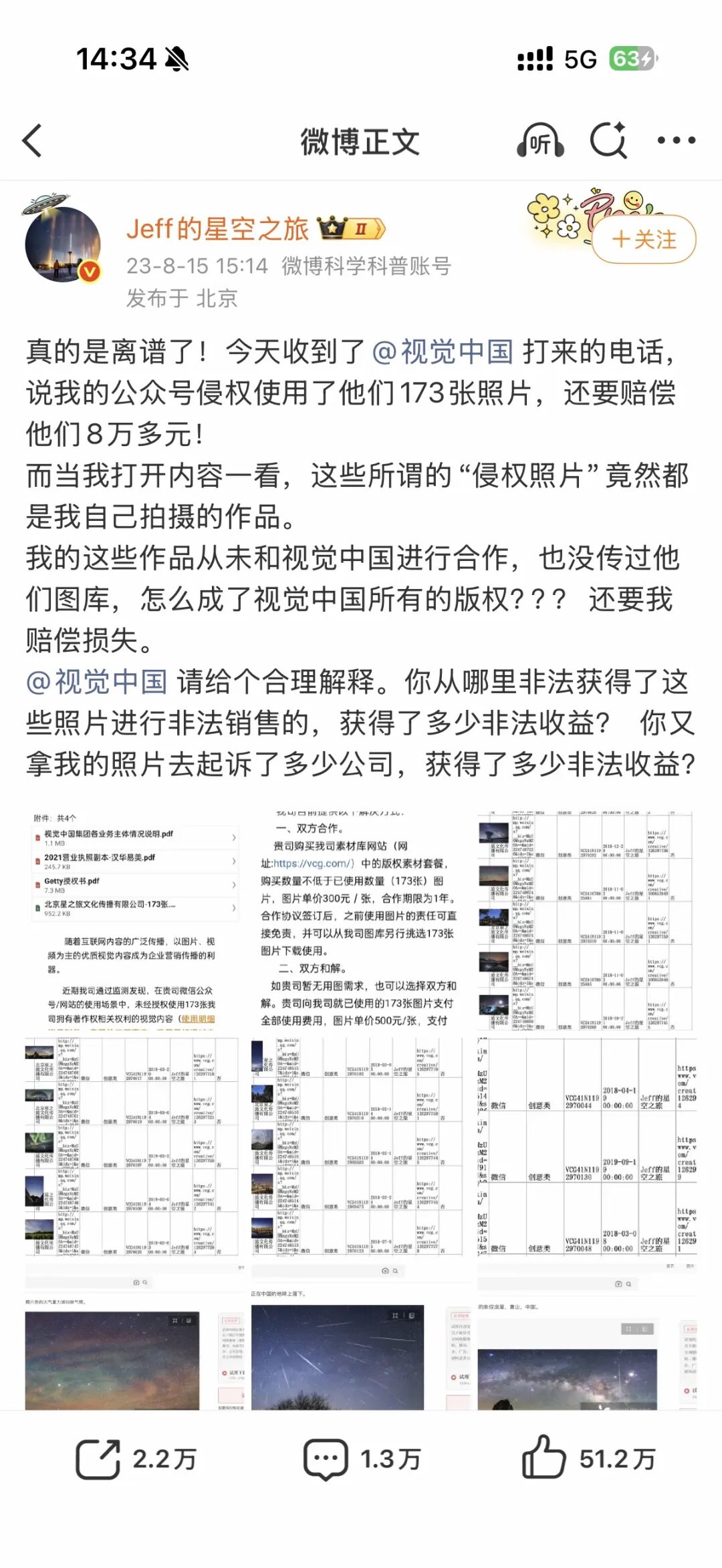 2023年,知名星空摄影师戴建峰发文称,视觉中国打来电话,宣称他的公众号侵权使用了视觉中国 173 张照片,并索要 8 万多元的版权费。戴建峰经查实发现,这些所谓的"侵权照片"居然是自己亲手拍摄的作品。