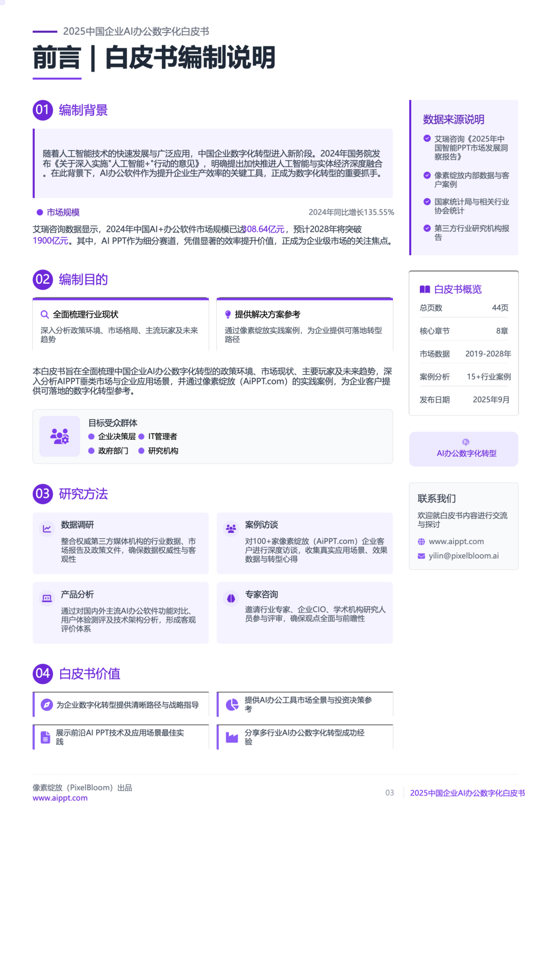 AI办公早已不是“用AI写文档、做PPT”的单点需求。白皮书指出,2025年起,AI办公软件将全面向全流程智能平台进化——比如像素绽放PixelBloom的AiPPT.com,能通过API与企业OA、CRM、知识库无缝对接,实现“数据自动提取→PPT智能生成→跨部门协同审核”的闭环,彻底打破信息孤岛。