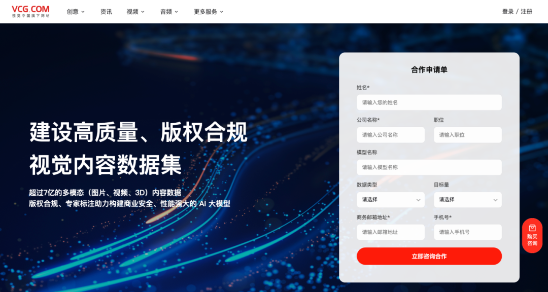 目前,视觉中国数据服务业务“合作申请通道”已正式开启。欢迎通过官方页面提交合作意向,我们的专业团队将尽快与您接洽。