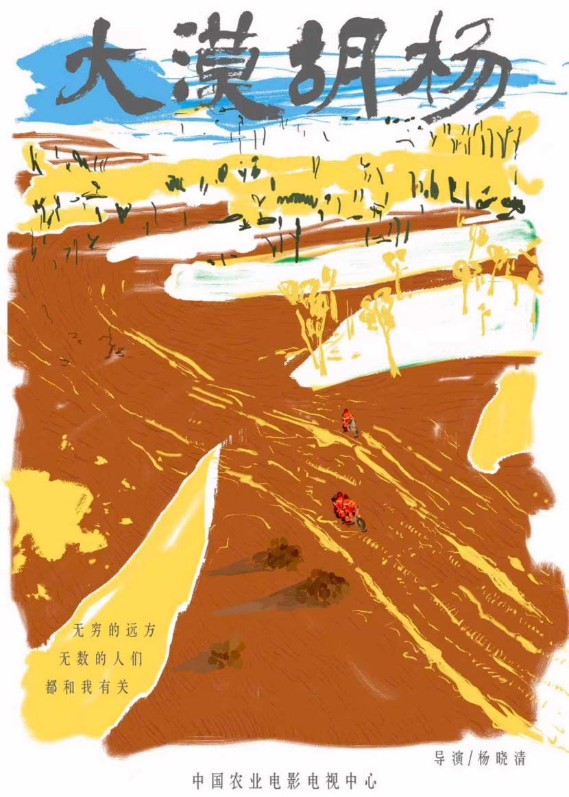 胡杨林与人物形象相互映衬,沙漠色彩与点缀的绿色胡杨碰撞充满生命力量。